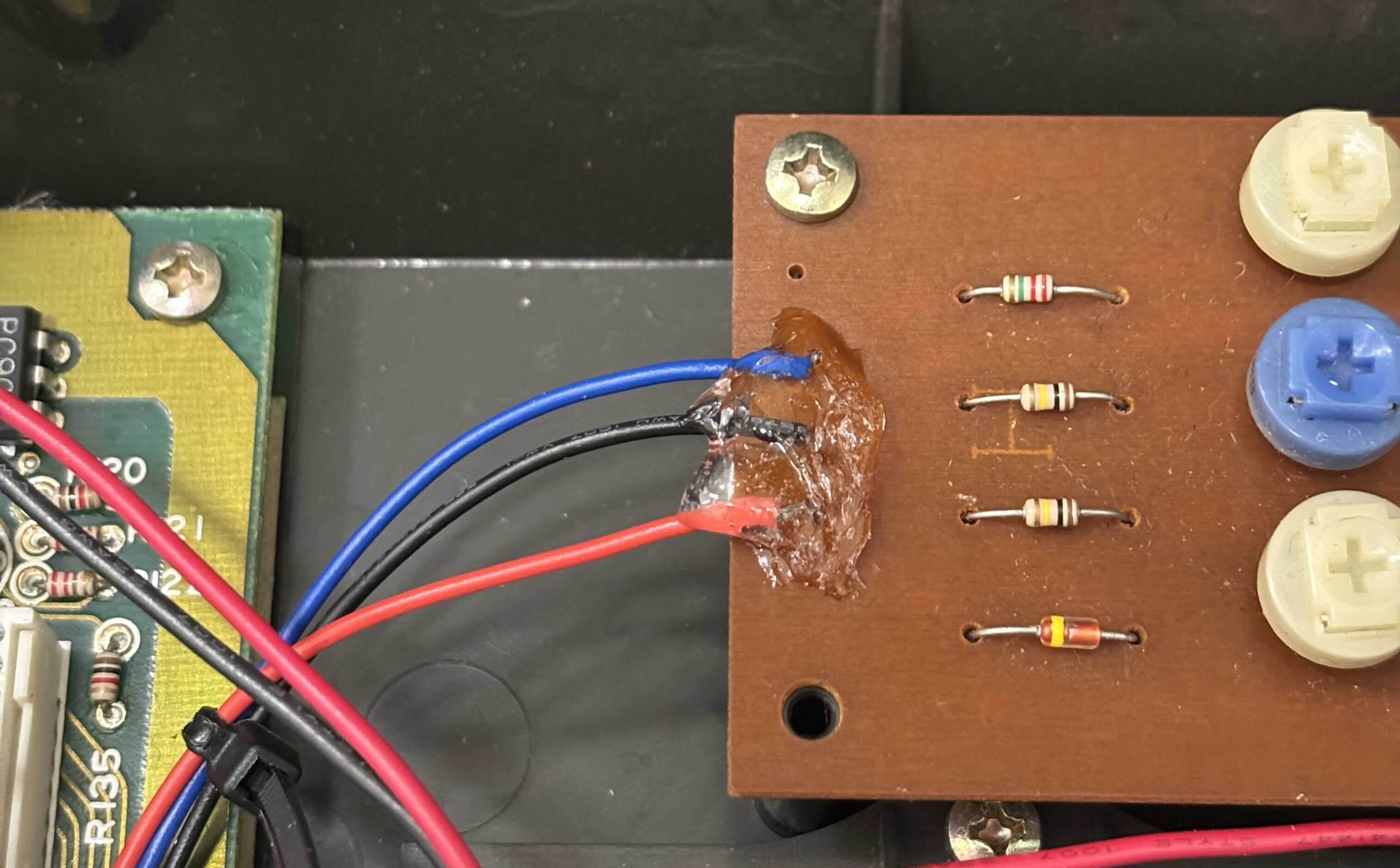 Tuning these inputs was evidently a last-minute thought as the trimming potentiometers for tuning, pitch bend, and vibrator were included on an auxiliary board connected by jumper wires soldered directly to the main board, contrasting the convenient header connectors going between the other boards. These jumper wires are thin-gauge stranded wire and weren't secured in any way when I opened my keyboard. Merely by moving these wires, I was able to further disable the pitch bend and fix the original tuning problem.